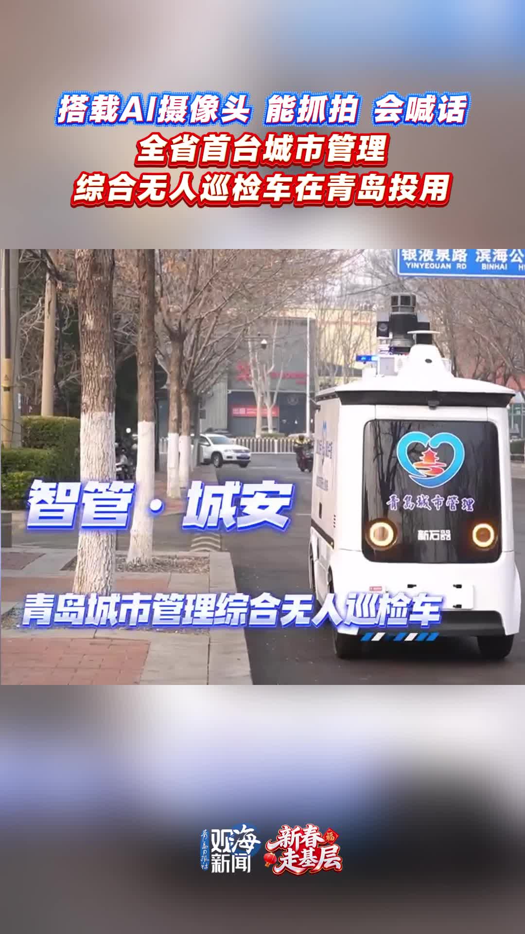 新春走基层丨搭载AI摄像头,能抓拍,会喊话!全省首台城市管理综合无人巡检车在青岛投用