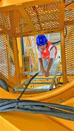 几个小时以前,胡海洋通过笔直的“云梯”,手脚并用攀爬进这个不足2平方米的驾驶室后,还没有下去过。 “在攀爬的过程中,还要注意检查塔身上的标准节螺丝是否松动。最近雨水多,每天要花更多的精力和时间去检查并拧紧螺丝,避免在高空作业时因此发生晃动的危险事件。 ”胡海洋告诉记者,检查塔吊钢绳、打黄油保养也是每天正式作业前的必备工作。 “看着没多复杂,这一路垂直攀爬上去,同时做到不断进行高空检查,其实很耗费体力,光这一通操作,到了顶上就已经是一身大汗了。 ”胡海洋告诉记者,就因如此,他上到驾驶室后的第一件事就是迫不及待地打开窗户通风,凉快凉快。