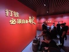 在展馆特别设置的海尔砸冰箱场景、青岛港5G自动化码头全景及“一钩准”模拟操作、“蛟龙号”深潜及海底实物采集、模拟打铁等一系列具有操作性、体验性、吸引力、感染力的现场教学设施处,大家纷纷上前仔细察看,进行模拟操作。在“打铁必须自身硬”模拟打铁装置处,大家挥锤感受打铁的过程,体验打铁的原理,感悟“四个铁一般”的要求和“五个过硬”的内涵,体悟千锤百炼、百炼成钢的哲理。