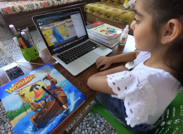 叙利亚女孩玛拉正在上私立学校的线上课程。新华社发