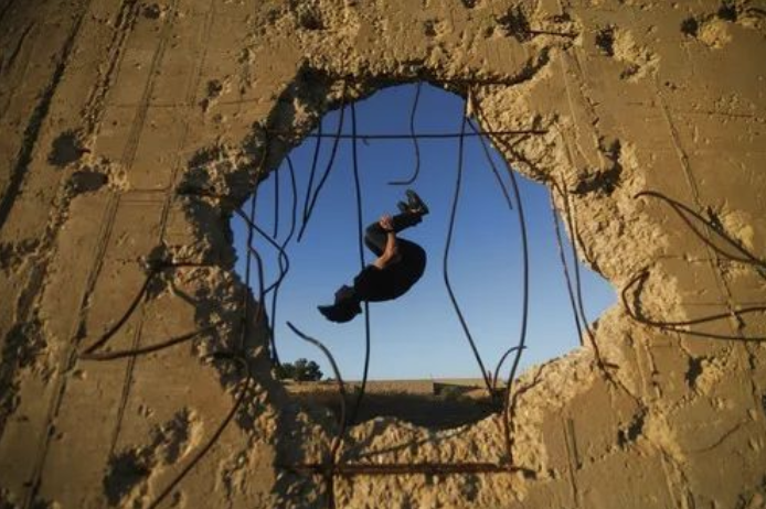 8月17日,在加沙地带的汗尤尼斯,巴勒斯坦少年日落时分练习跑酷。新华社发