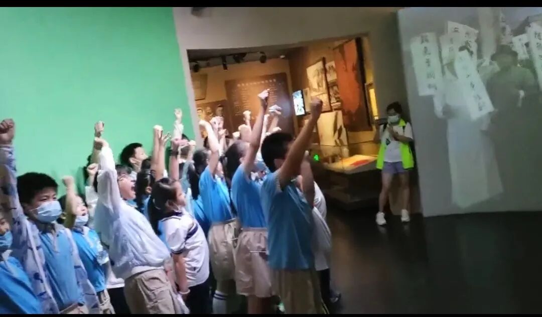 当孩子们站在五四运动游行队伍投影墙前,听到再次喊出“誓死力争 还我青岛”的口号时,仿佛穿越到了那段屈辱的岁月中,仿佛站在了那群奋起抗争的英雄们中间,燃烧着他们一颗颗赤子之心,情不自禁的大声的发出“还我青岛”的声声呐喊,一声声的口号中孩子们热血沸腾,屈辱、怒火与激情交织在一起,像风筝线一样缠绕着孩子们的心,一点点收紧。