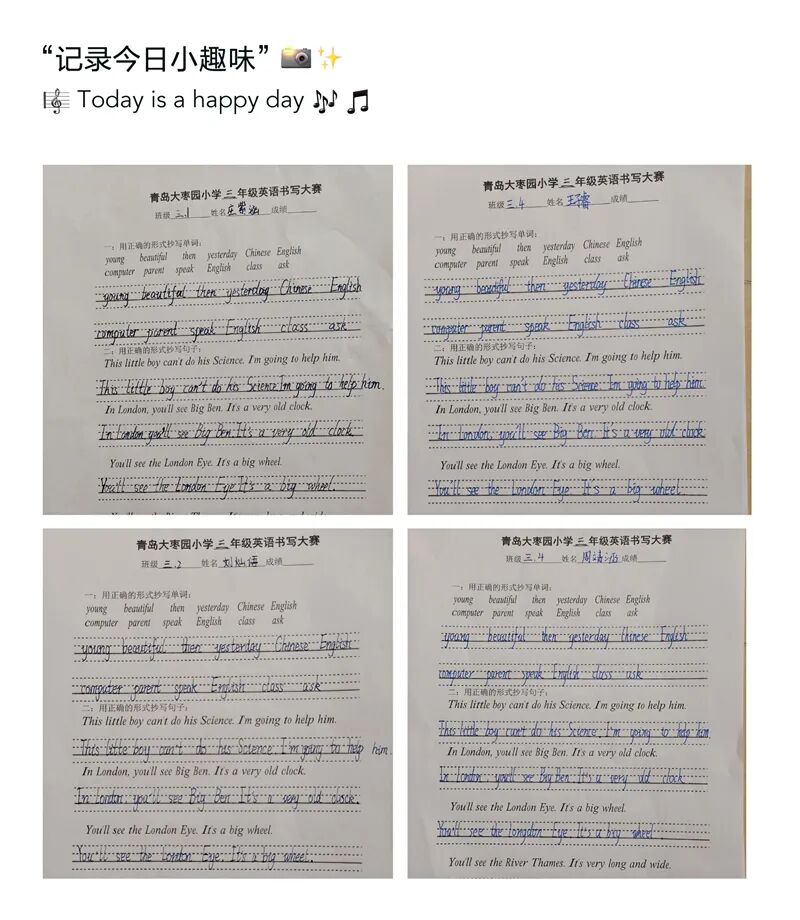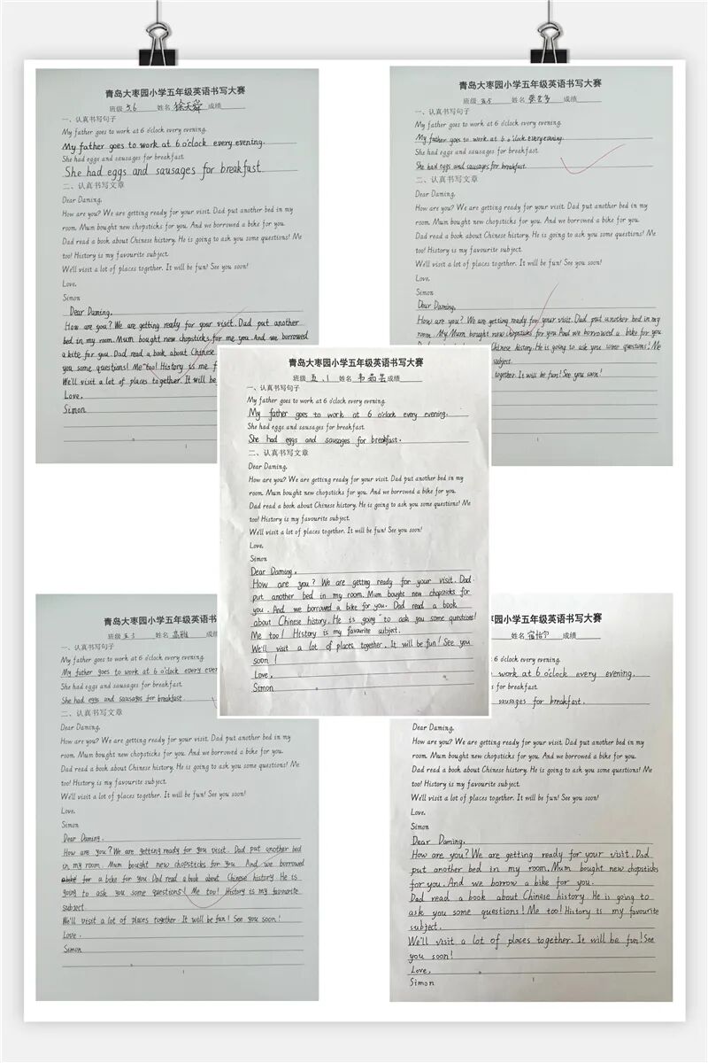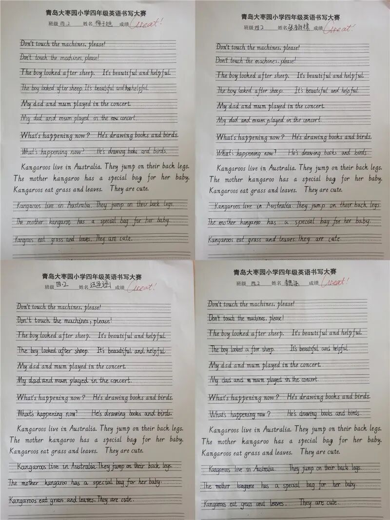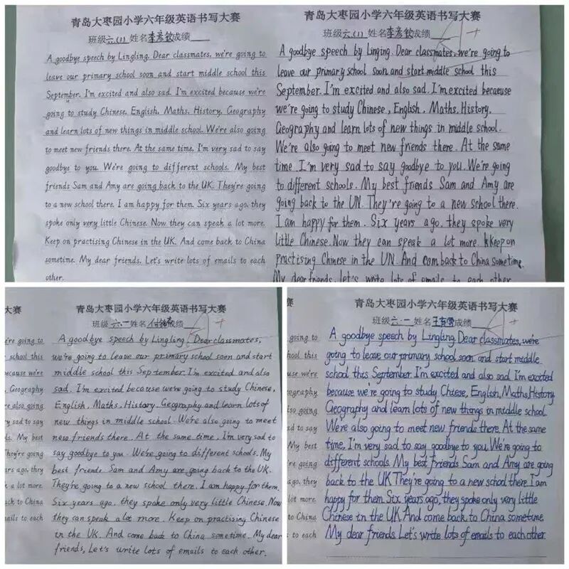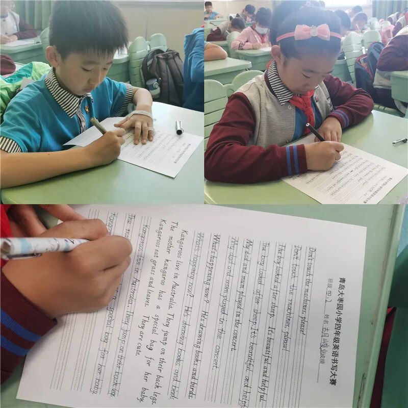 为激发学生对英语的学习兴趣,规范学生的英语书写,丰富学生的校园生活,为学生提供一个展现个人风采的平台,近日,青岛大枣园小学举行了英语书写大赛。