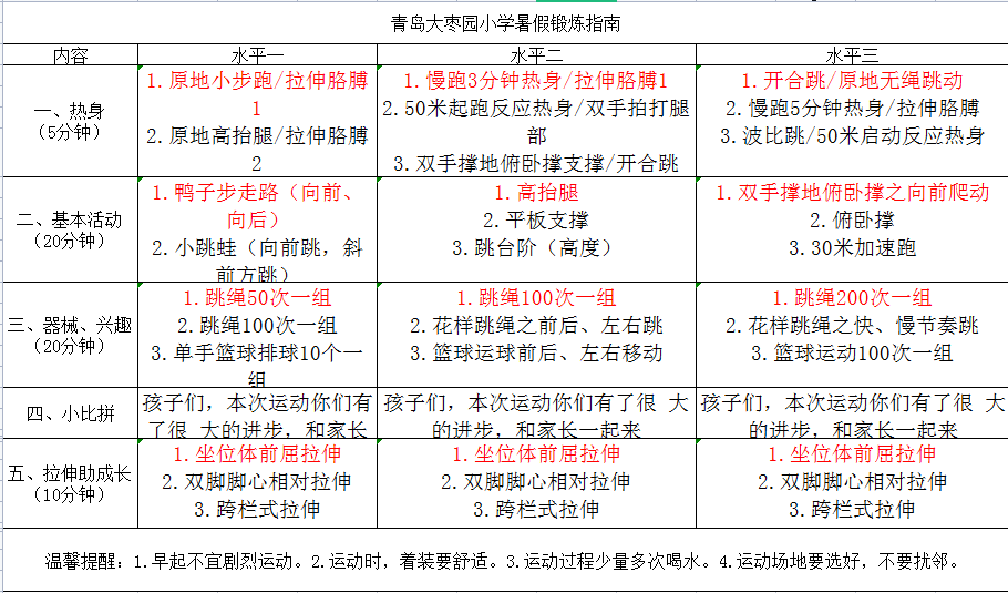 运动的过程中注意做好自我防护,穿着合适的服装,多多喝水。希望暑假过后,你们归来还是一群轻快活泼的小可爱!