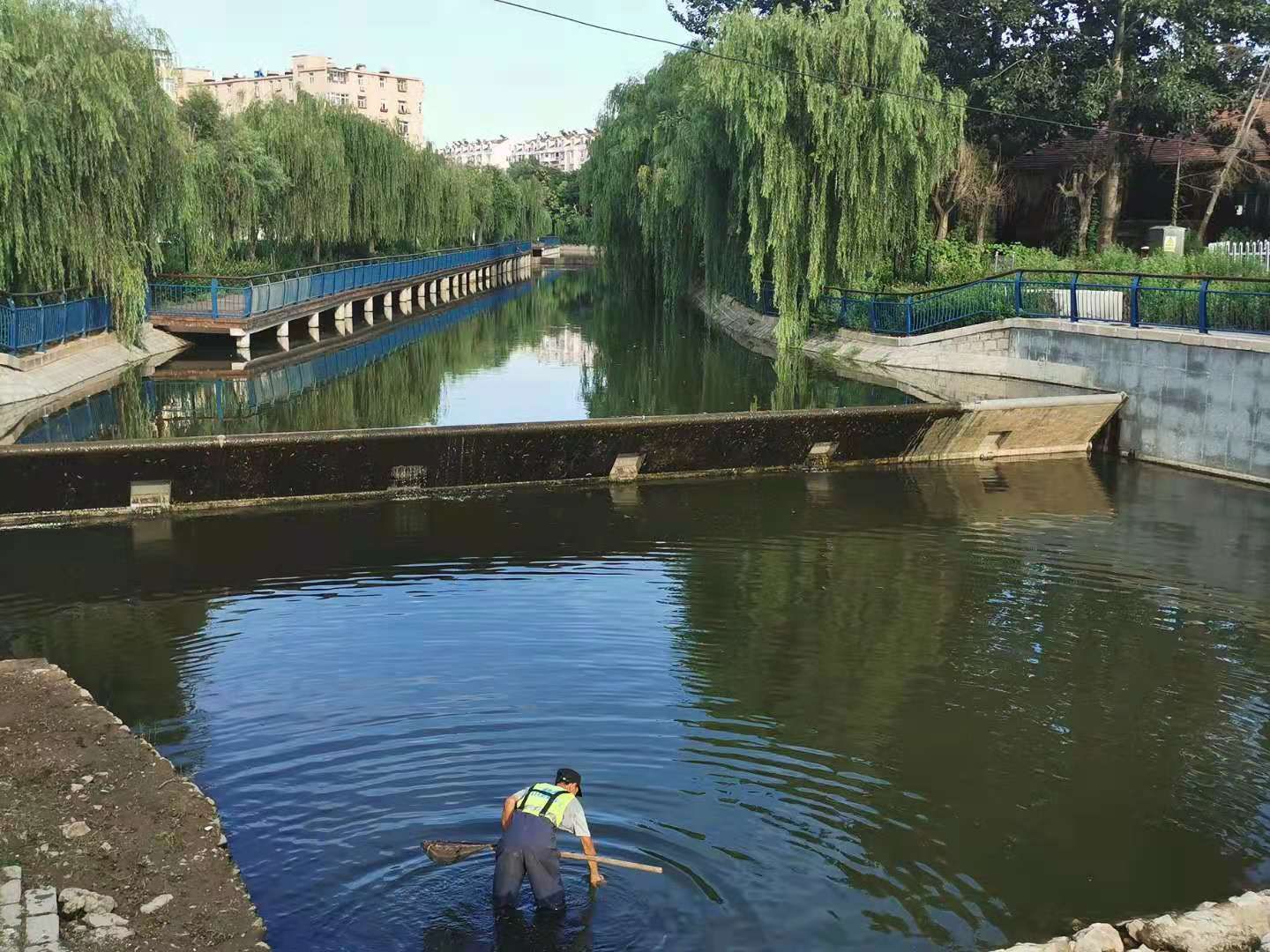 沿着河道,记者一直走到下游的永平路附近,发现整条河道水体都十分干净清澈,几乎没有漂浮的杂物。在永平路桥下河段,一名穿着胶皮衣裤的环卫工人正在河道内保洁,他手持带着网兜的长竹竿,往返于两岸,将河面漂浮的落叶和杂物逐一清理干净。