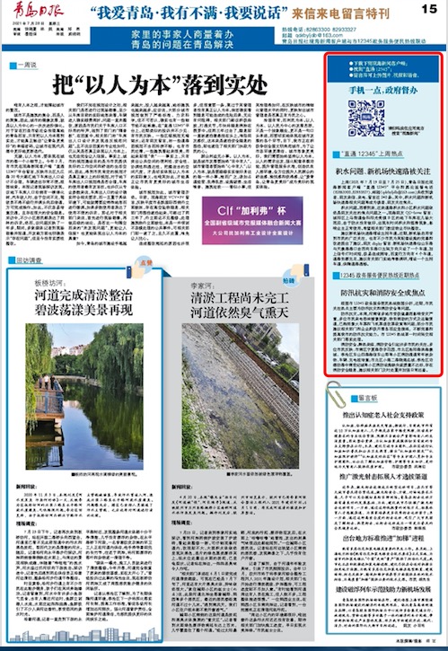 上周(2021年7月19日至7月25日),青岛日报社观海新闻客户端“直通12345”平台和舆论监督电话(82863300、82933327)、邮箱(qdrbyljdb@163.com)共收到读者、网友来信、来电、留言近240条。其中,积水问题和新机场快速路相关问题等成为读者、网友关注焦点。