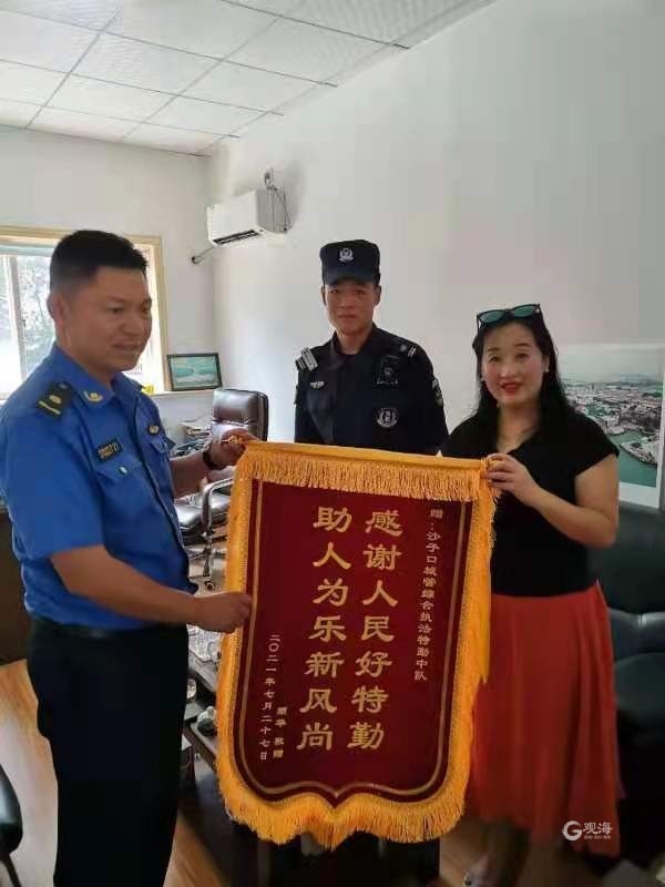 事隔一周,原本以为此事只是执法日常中的普通工作,没想到颜女士竟然主动找到沙子口执法中队,向执法人员送上一副锦旗,并激动地表示,“真的很感谢工作人员,那天差一点就耽误了孩子的事,幸亏有你们,你们是助人为乐的好榜样!”