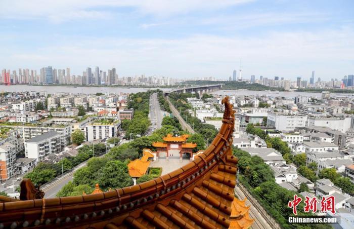 ↑图为8月6日,在黄鹤楼上拍摄的武汉长江大桥。 中新社记者 张畅 摄