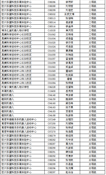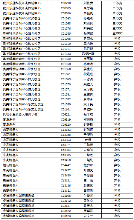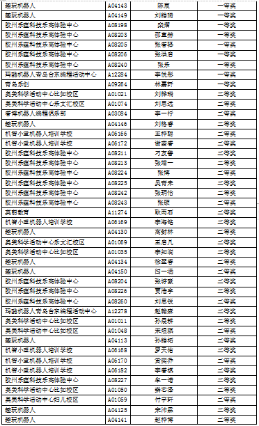 2021年青岛市少年儿童智能机器人公开赛暨“AI探索”城市选拔赛(青岛)活动在青岛市妇女儿童活动中心圆满落幕,本次比赛共有五项赛事,上千名学生参与,经过8月2日、3日两天的激烈角逐,根据现场裁判打分,现将成绩公布如下。