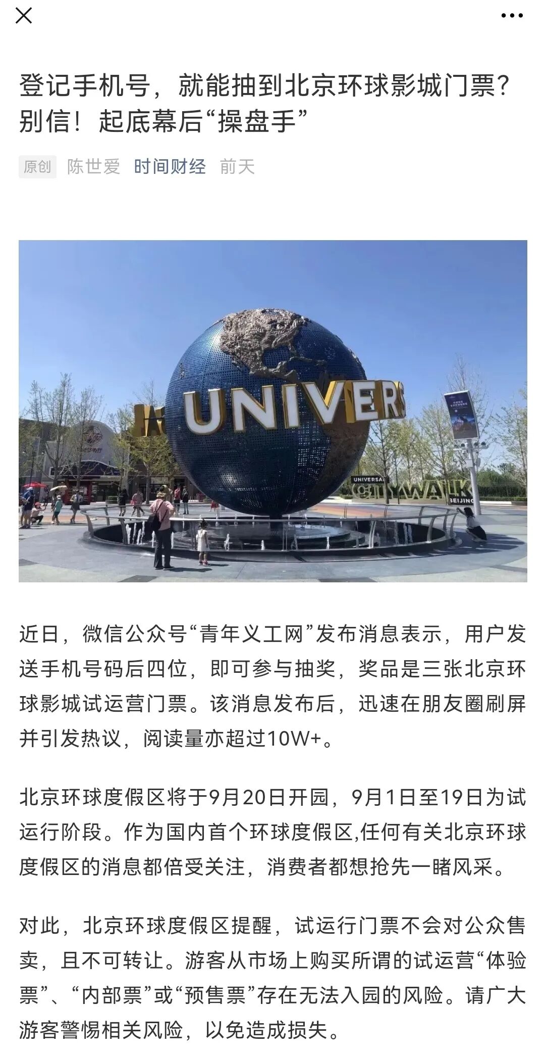 近日,微信公众号“青年义工网”发布消息表示,用户发送手机号码后四位,即可参与抽奖,奖品是三张北京环球影城试运营门票。该消息发布后,迅速在朋友圈刷屏并引发热议,阅读量亦超过10W+。