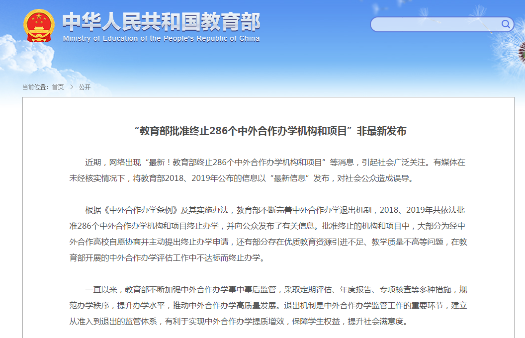 近期,网络出现“最新!教育部终止286个中外合作办学机构和项目”等消息,引起社会广泛关注。