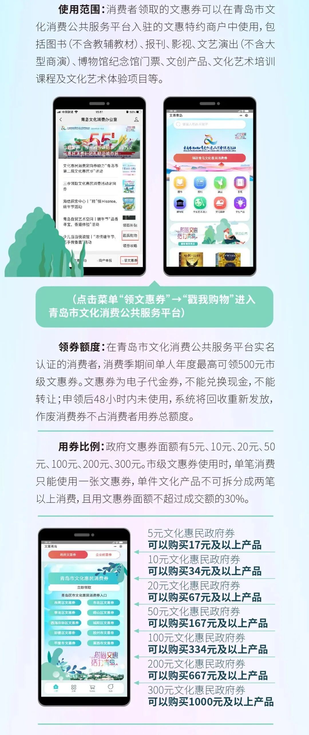 问:文化惠民消费券什么时候发放?答:文化惠民消费券文定期发放,可关注“青岛文化消费办公室”公众号推文和文惠商户微信群海报,发券前会有相关预告推文和发券预告宣传海报。