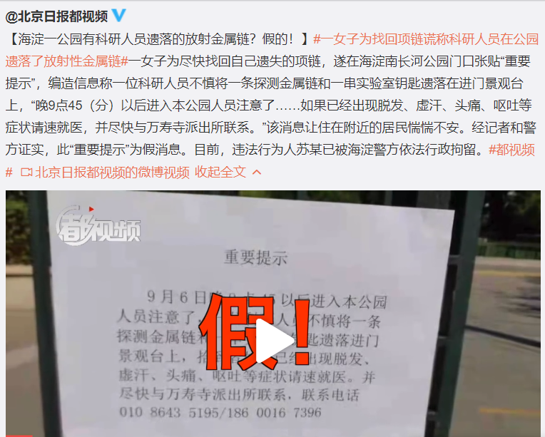 一女子为尽快找回自己遗失的项链,遂在海淀南长河公园门口张贴“重要提示”,编造信息称一位科研人员不慎将一条探测金属链和一串实验室钥匙遗落在进门景观台上,“晚9点45(分)以后进入本公园人员注意了……如果已经出现脱发、虚汗、头痛、呕吐等症状请速就医,并尽快与万寿寺派出所联系。”该消息让住在附近的居民惴惴不安。