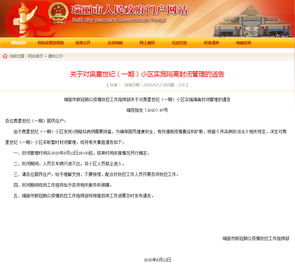 通告称,瑞丽市奥星世纪(一期)小区发现1例疑似病例需要排查,为确保居民健康安全,有效遏制疫情蔓延和扩散,根据《传染病防治法》相关规定,决定对该小区一期、二期分别采取暂时封闭管理、暂时自行居家隔离管理措施。