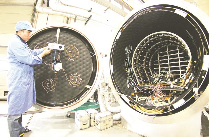 2018年9月17日,技术人员在513所准备对微纳卫星零部件进行真空试验。(资料片)