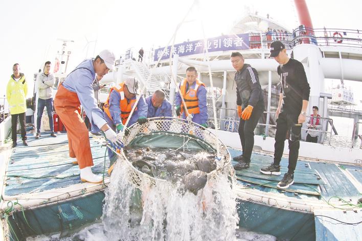 工作人员将一批斑石鲷倒入运鱼船。(资料片)