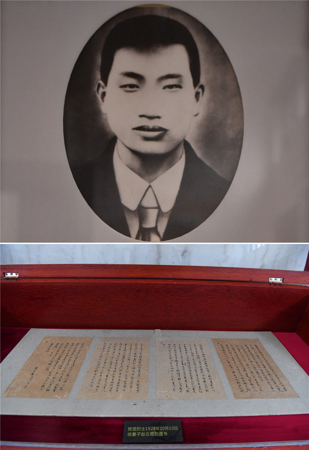 拼版照片:上图为陈觉像;下图为湖南省长沙市烈士公园展出的陈觉烈士写给妻子赵云霄的遗书(2018年5月7日摄)。新华社发
