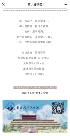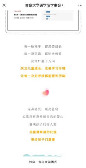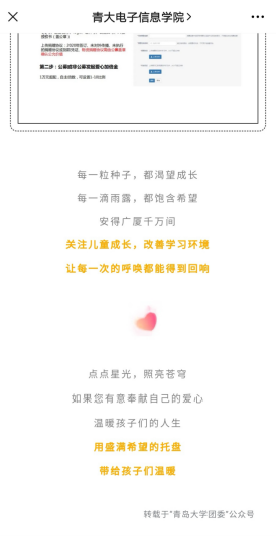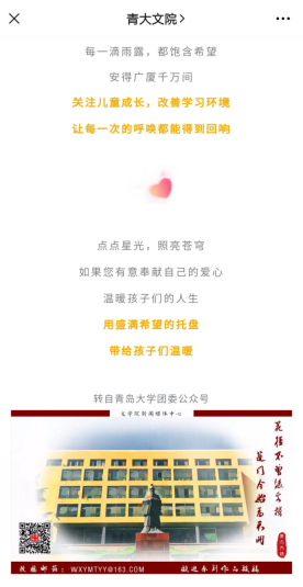 作为主力军的青大学子们反应尤其热烈。他们主动参与,献出爱心,不仅依靠自身为希望小屋献力,还积极通过社交平台等媒介进行更广的宣传,让希望小屋募捐活动由校内更深层次地延展到校外。在校内外互通互达的过程中,使希望小屋募捐活动更加地顺利开展。