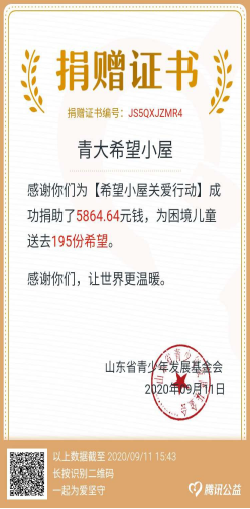 点亮一个孩子的梦想,为弟弟妹妹添一束光,青大人的这些心意聚在一起,彰显出非凡的力量。72小时,募集资金8万,全省高校中排名第三.....这些数字既是青大人的善良品格的凸显,也是家庭贫困的孩子的希望。另外,前期校团委认捐泗水县的2个小屋的资金也已到位。