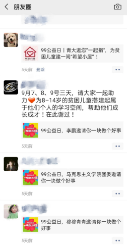 9月7日至9月9日三天公益日期间,包括学校官方微信在内的45个学院和部门的官方微信都转发了校团委的募捐倡议,总阅读量达30000余人,为“希望小屋”爱心募捐营造了良好的氛围。