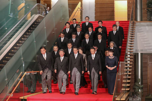 2019年9月11日,在日本东京首相官邸,日本首相安倍晋三(前排中)率阁僚走下楼梯,准备合影。新华社记者杜潇逸摄