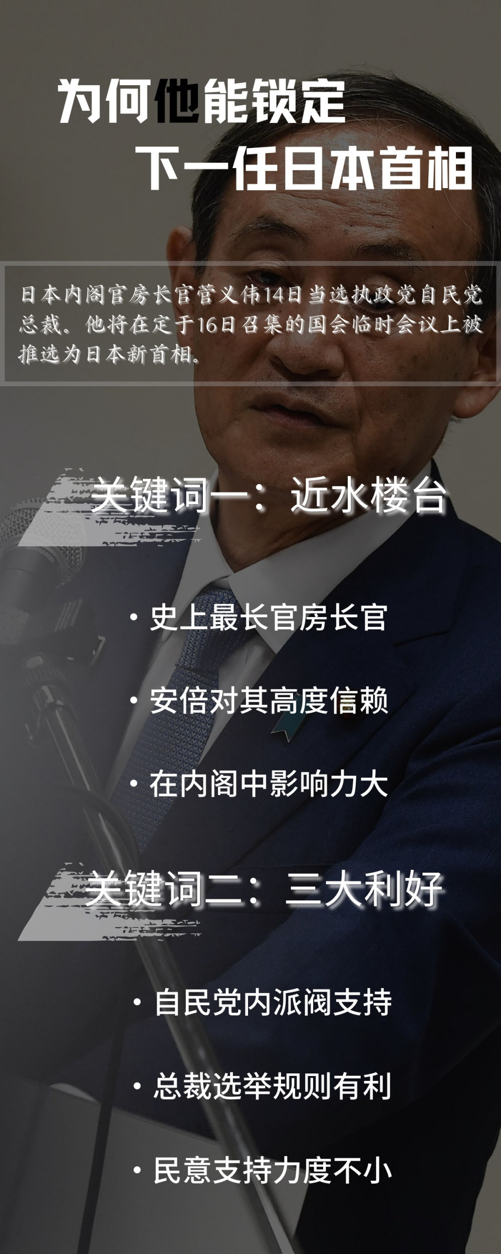 新华社东京9月14日电 日本内阁官房长官菅义伟在9月14日举行的自民党总裁选举中获胜。作为日本执政党总裁,菅义伟将在9月16日的临时国会上被指名为新的日本首相。