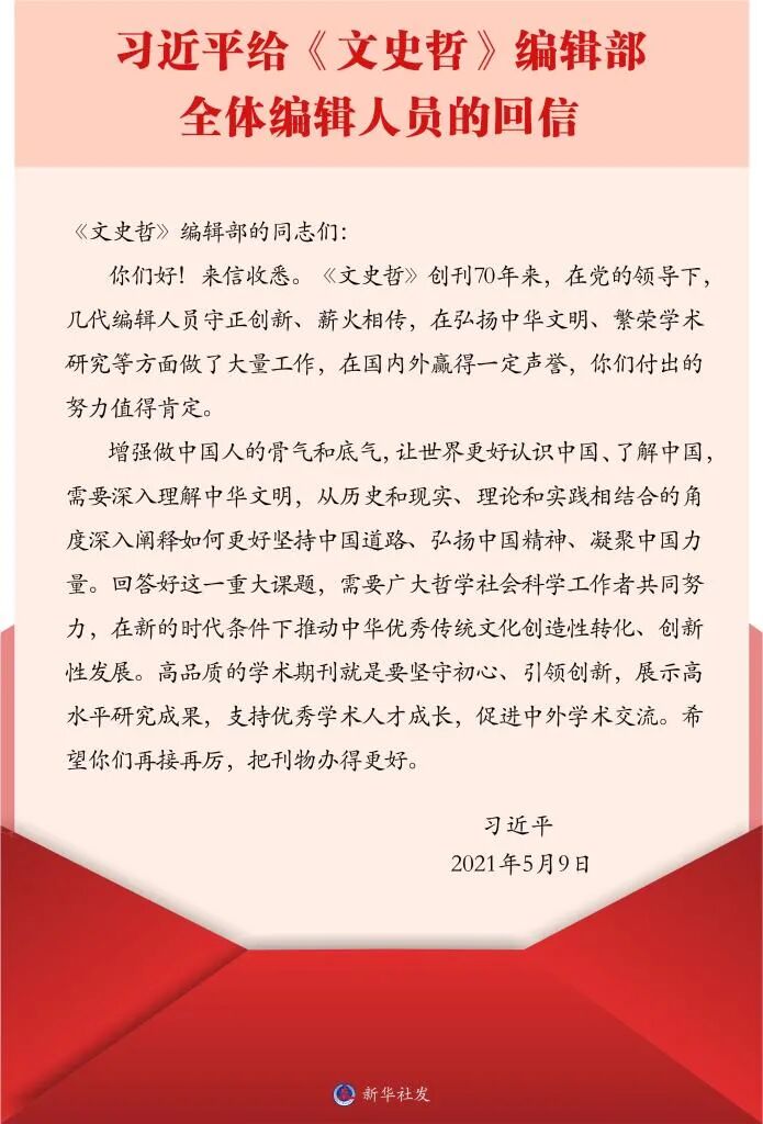 2021年5月9日,习近平总书记在给《文史哲》编辑部全体编辑人员回信中,对《文史哲》创刊70年来的努力给予充分肯定。