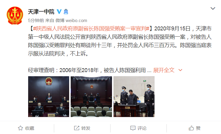 【陕西省人民政府原副省长陈国强受贿案一审宣判】2020年9月15日,天津市第一中级人民法院公开宣判陕西省人民政府原副省长陈国强受贿一案,对被告人陈国强以受贿罪判处有期徒刑十三年,并处罚金人民币三百万元。陈国强当庭表示服从法院判决,不上诉。