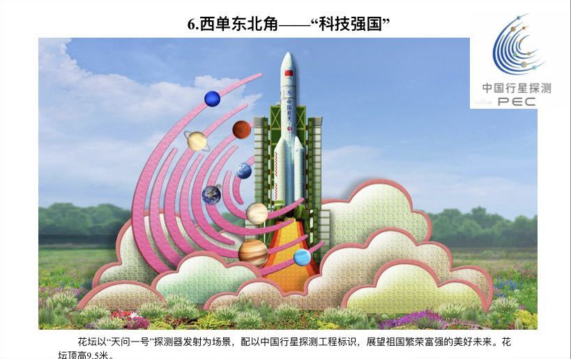 西单东北角主题花坛为“科技强国”,花坛顶高9.5米,以“天问一号”探测器发射为场景,配以中国行星探测工程标识,展望高科技助力祖国繁荣富强的美好未来。