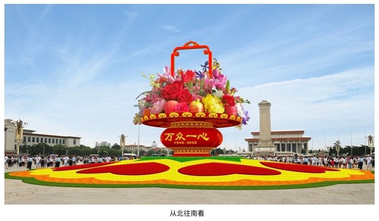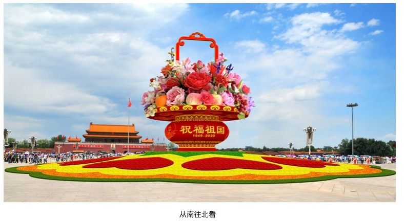天安门广场中心将布置“祝福祖国”主题花坛,花坛顶高18米,以喜庆的花果篮为主景,花篮为钢架结构,篮身为玻璃钢材质,可抗10级风。