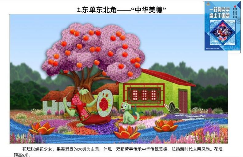 东单东北角花坛主题为“中华美德”,花坛顶高8米,以绣花少女、果实累累的大树为主景,体现一双勤劳手传承中华传统美德,弘扬新时代文明风尚。
