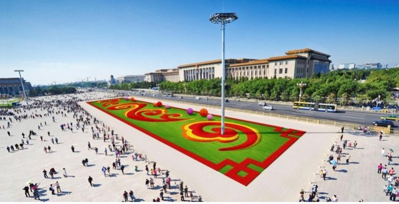 天安门广场两侧绿地则延续吉祥如意花带的布置方式,花卉布置总面积将达4900平方米,共摆放花球18个。