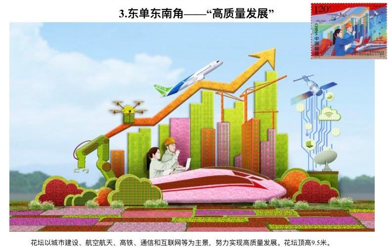 东单东南角将打造“高质量发展”主题花坛,花坛顶高9.5米,以城市建设、航空航天、高铁、通信和互联网等为主景,展示我国高质量发展取得的巨大成就。