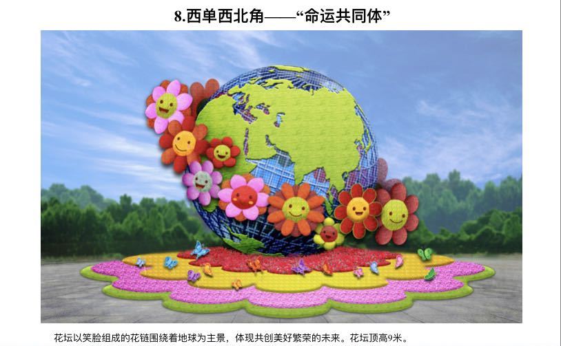 西单西北角布置“命运共同体”主题花坛,花坛顶高9米,以笑脸组成的花链围绕着地球为主景,体现全世界人民携手共创美好繁荣的未来。