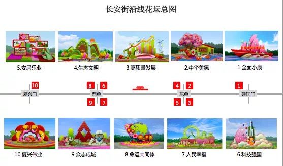 今年,长安街沿线将布置主题花坛10处。东长安街5处花坛将集中展示祖国各项发展的历史性成就,体现决胜全面建成小康社会取得的伟大胜利。西长安街的5处花坛则通过展望祖国的美好未来,体现全国人民众志成城,共襄中华民族复兴伟业。