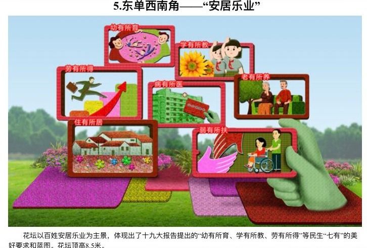 东单西南角布置“安居乐业”主题花坛,花坛顶高8.5米,以百姓安居乐业为主景,体现出了十九大报告提出的“幼有所育、学有所教、劳有所得”等民生“七有”的美好愿景正在实现。