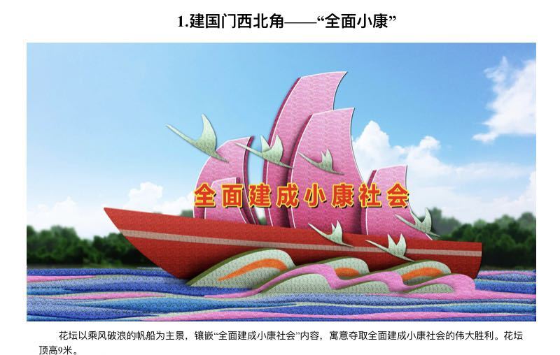 建国门西北角布置“全面小康”花坛,花坛顶高9米,以乘风破浪的帆船为主景,镶嵌“全面建成小康社会”内容,寓意夺取全面建成小康社会的伟大胜利。