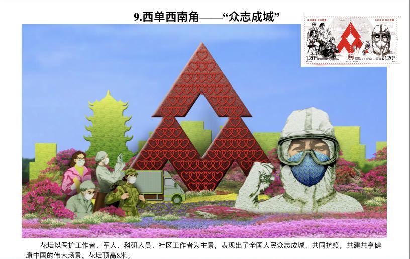 西单西南角花坛以“众志成城”为主题,花坛顶高8米,以医务工作者、军人、科研人员、社区工作者为主景,表现出全国人民众志成城、同心战“疫”,共建共享健康中国的感人场景。
