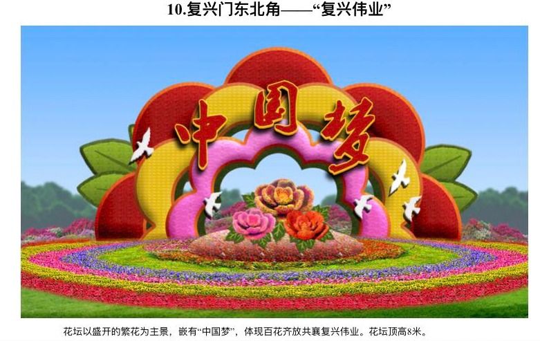 复兴门东北角布置“复兴伟业”花坛,花坛顶高8米,以盛开的繁花为主景,嵌有“中国梦”字体,展示出百花齐放共襄复兴伟业的美好祝愿。