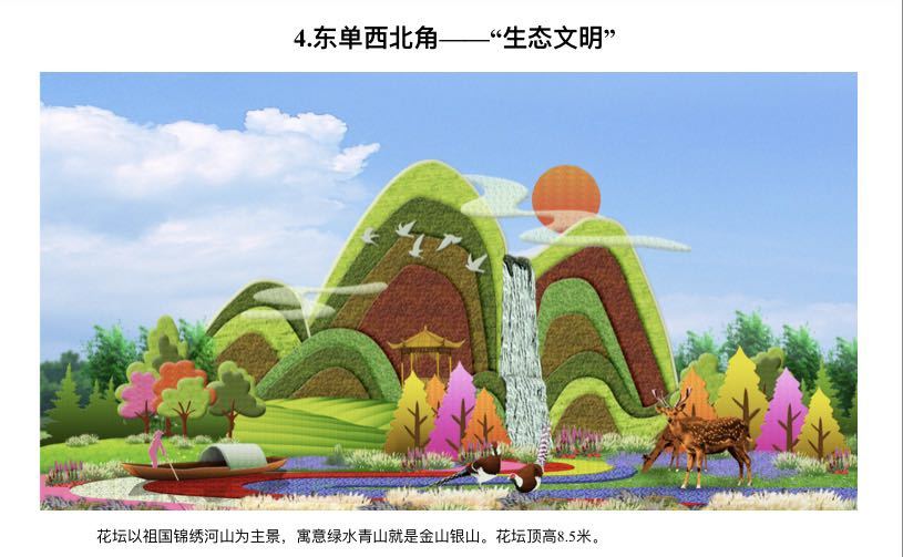 东单西北角花坛以“生态文明”为主题,花坛顶高8.5米,以祖国锦绣河山为主景,生动展示绿水青山就是金山银山的生态文明理念。