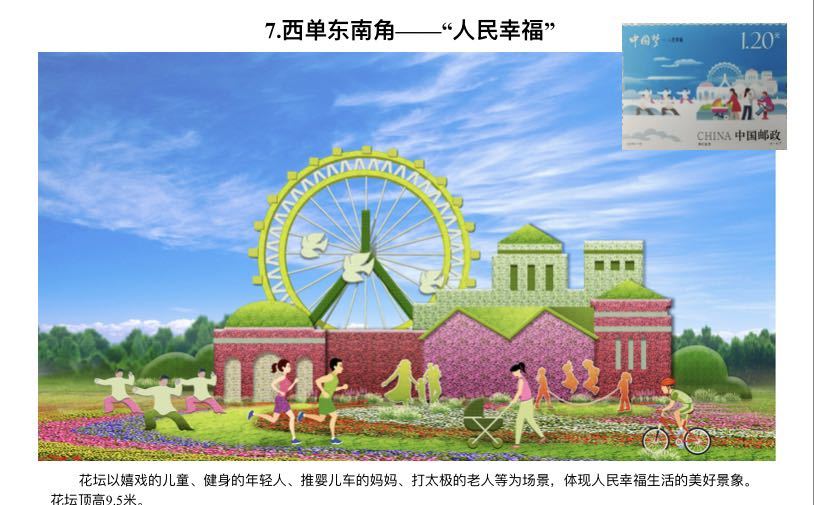 西单东南角打造“人民幸福”主题花坛,花坛顶高9.5米,以嬉戏的儿童、健身的年轻人、推婴儿车的妈妈、打太极拳的老人等为场景,展示全国人民幸福生活的美好景象。