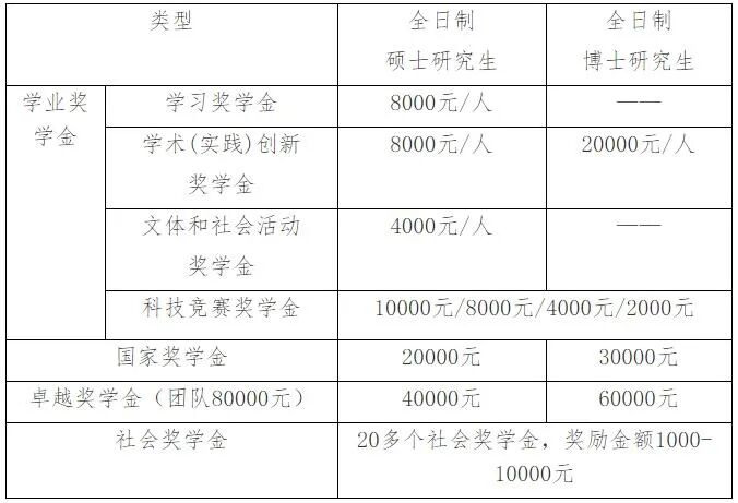 (二)奖学金。研究生奖学金包括学业奖学金、国家奖学金、卓越奖学金、专项奖学金四类,各培养层次的全日制研究生可申请相应类别奖学金。奖励标准如下:
