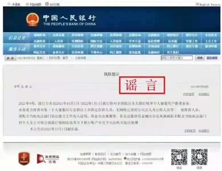 央行严正声明,此为假冒网页散布谣言,性质恶劣。