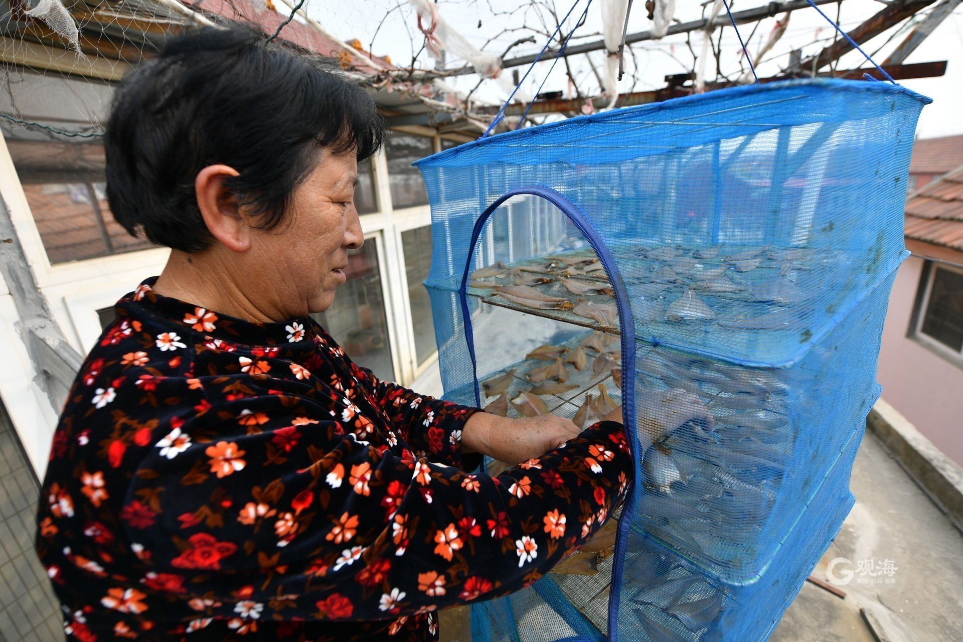 城阳区红岛街道的渔民在院子里晾晒青鳞鱼干。
