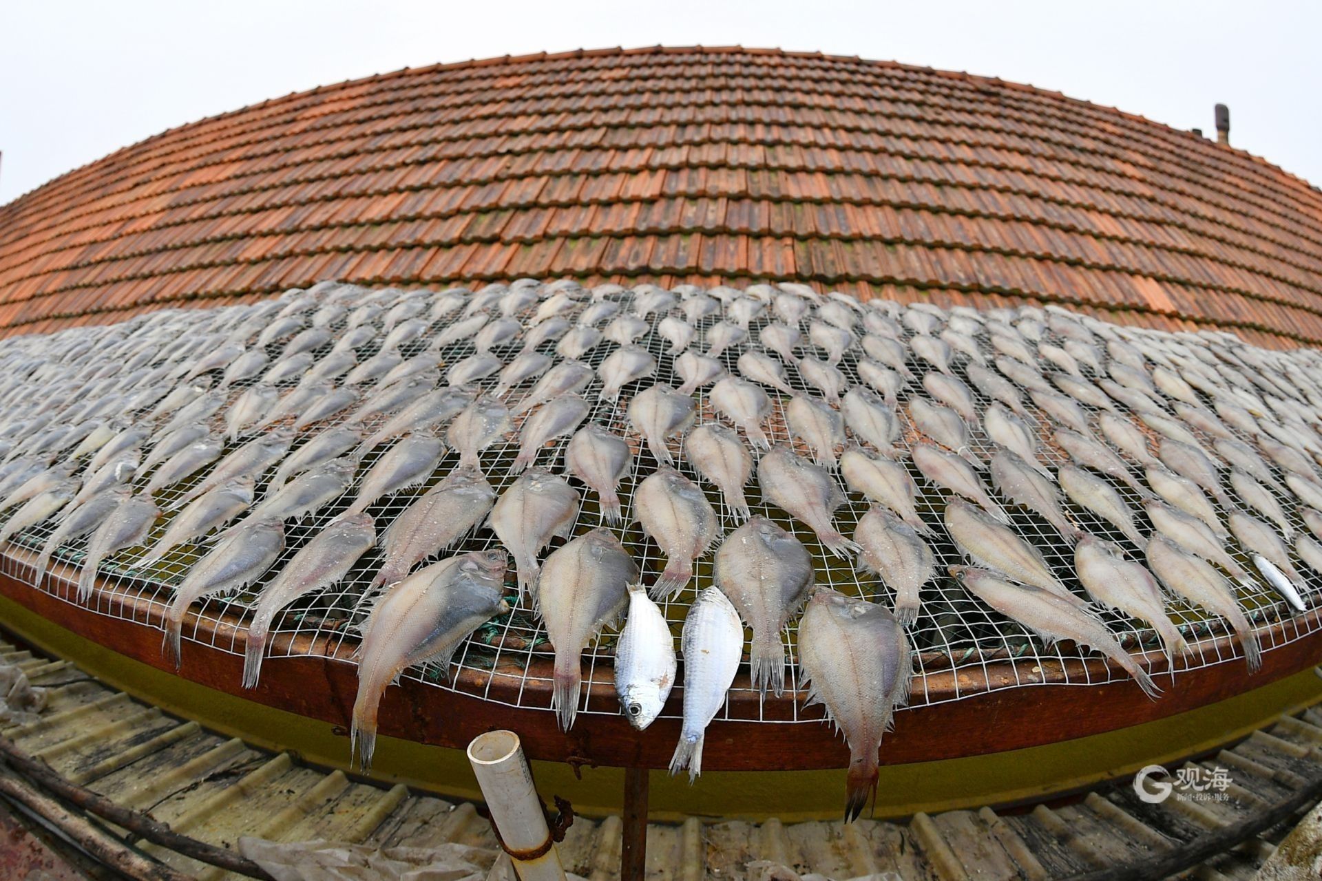 城阳区红岛街道的渔民在自家房顶上晾晒各种海鱼。