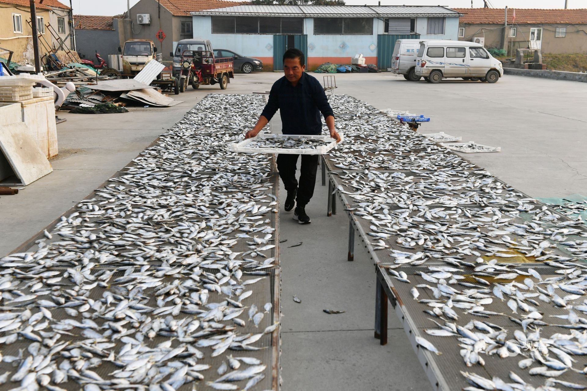 城阳区红岛街道的渔民利用晒鱼笼晾晒鱼干。