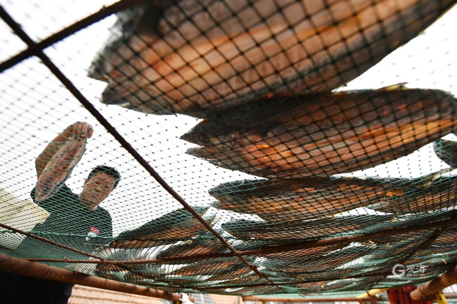 城阳区红岛街道的渔民在晾晒风味鲅鱼干。