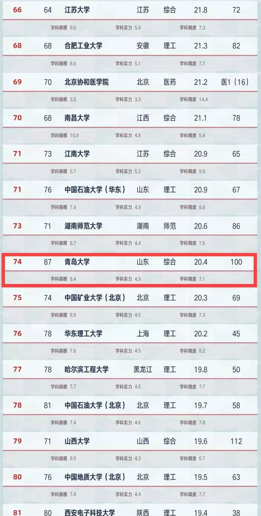 紧接着,9月24日,软科正式发布了2021软科中国大学学科水平排名,青岛大学位列全国第74位。