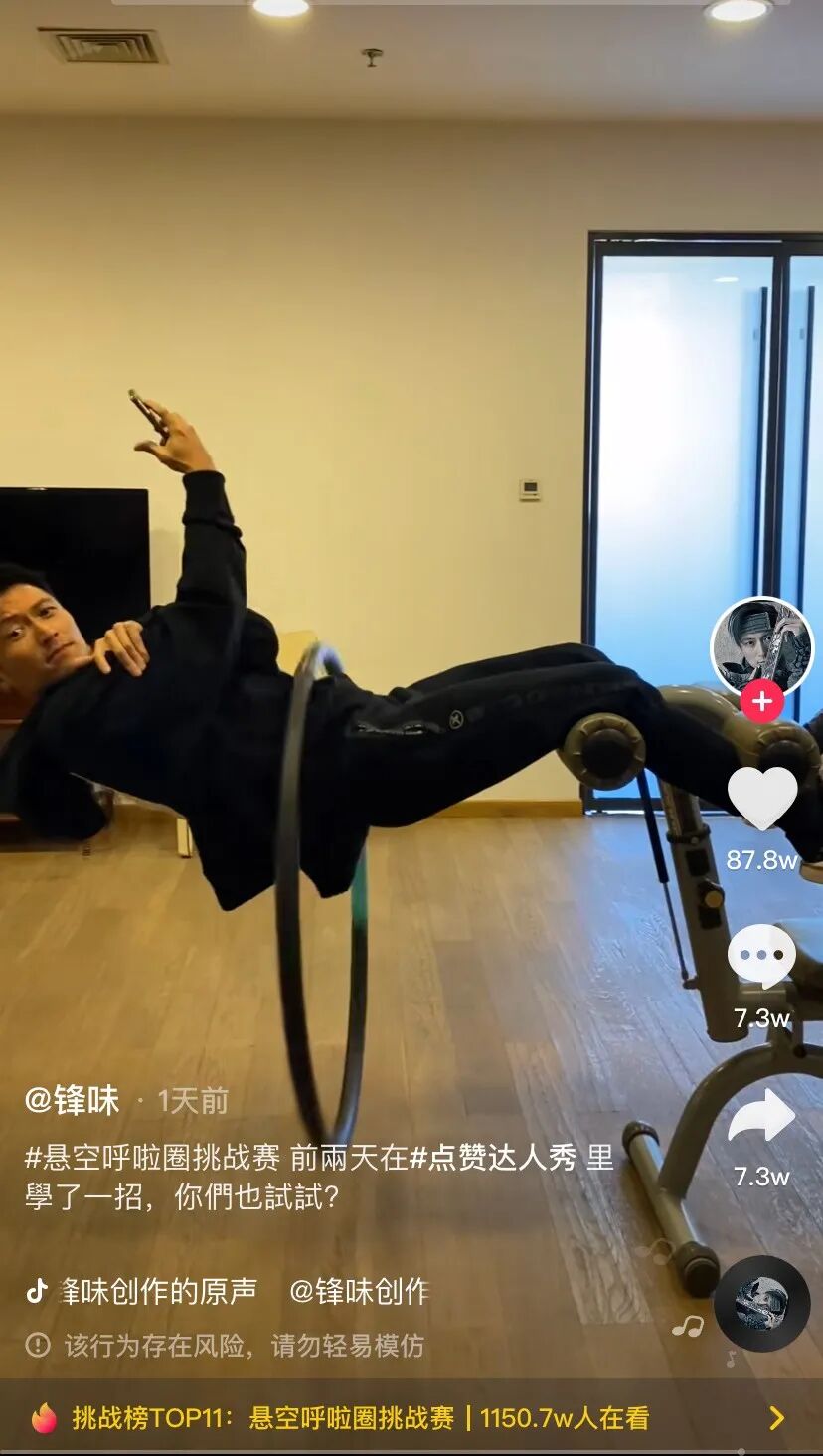 近日,男艺人谢霆锋在社交平台晒出一段视频,他把双腿夹在一个健身器材上,向后躺平使上半身悬空,在悬空状态下用腰腹力量转动呼啦圈,还一边刷手机。