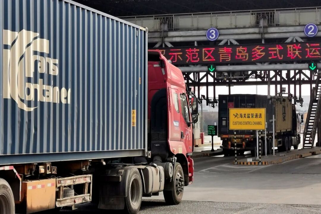 集装箱货物进入上合示范区青岛多式联运中心海关监管通道。陈星华 摄